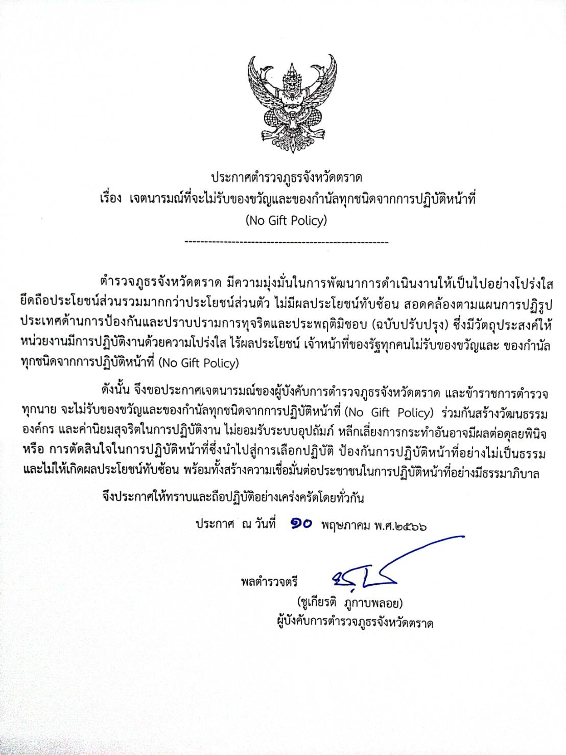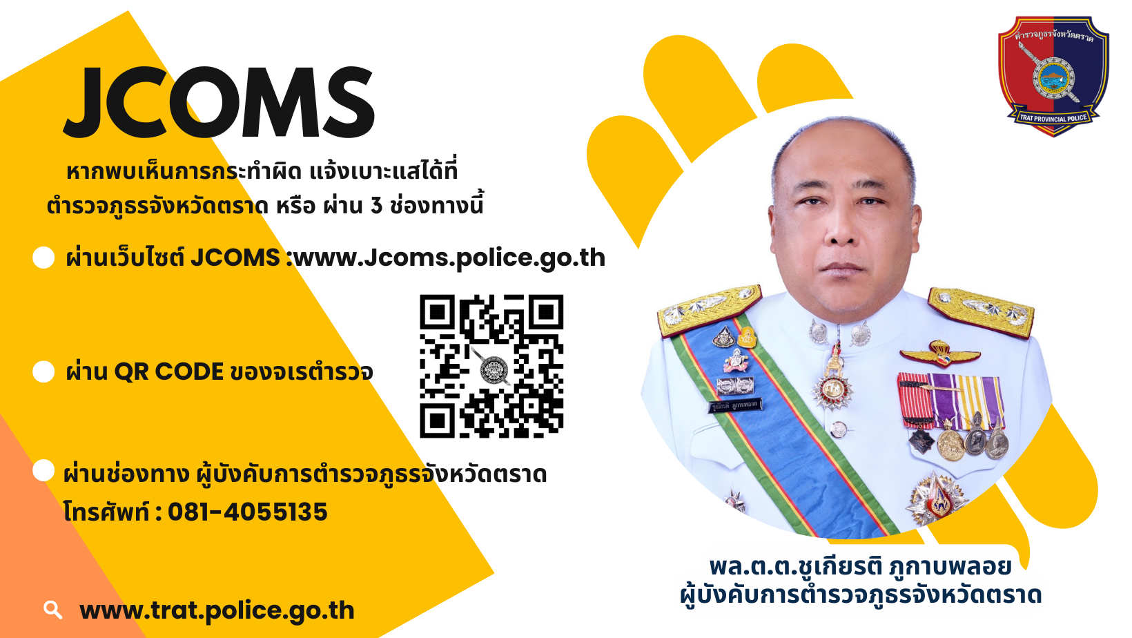 วันนี้ ( 20 ธ.ค. 66 ) เวลา 10.30 น. พล.ต.ต.ชูเกียรติ ภูกาบพลอย ผบก.ภ.จว.ตราด พร้อมด้วย พ.ต.อ.สุรเจตต